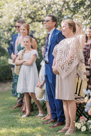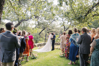 The ceremony took place on our back lawn. A string quartet played as the bride walked down the aisle, holding a bouquet of pink dahlias, lisianthus, and delicate blue flowers. Our back lawn is designed for outdoor summer weddings. It offers plenty of space and stunning views of the Texas Hill Country for guests to enjoy.